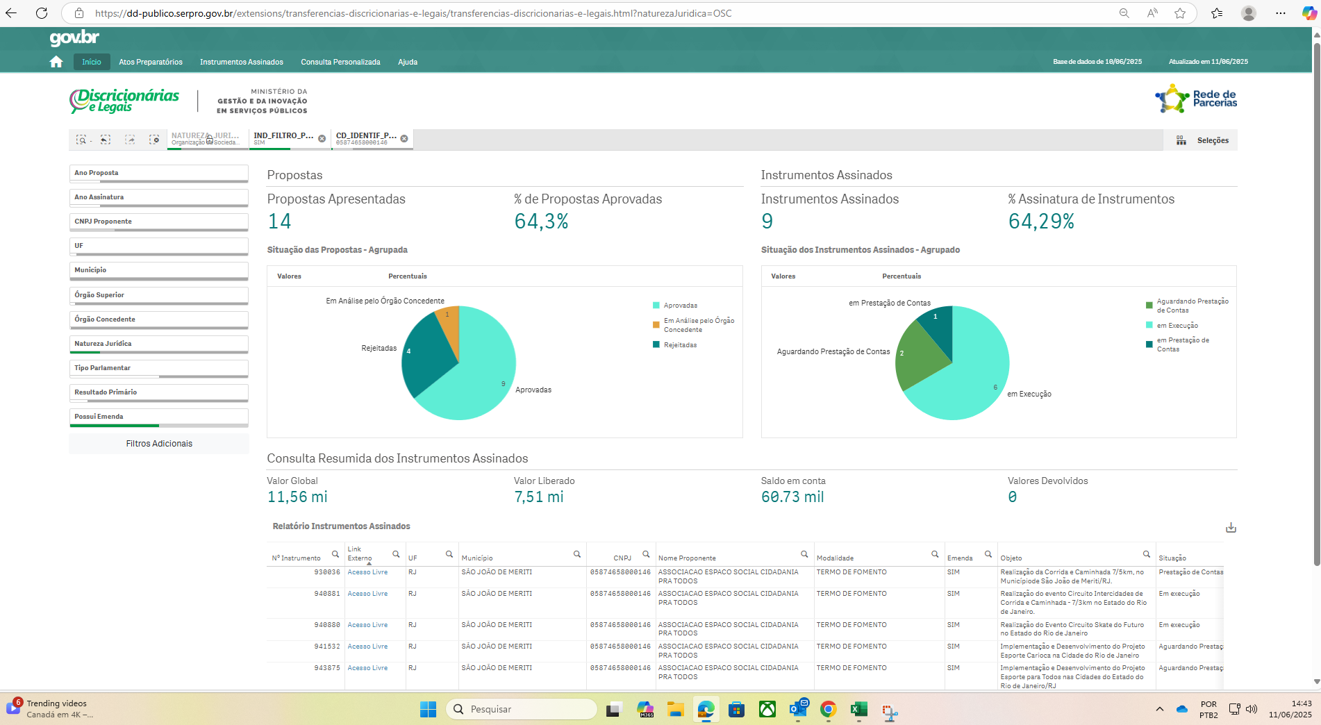 | 940881 | Link Externo | RJ | SÃO JOÃO DE MERITI | 5874658000146 | ASSOCIACAO ESPACO SOCIAL CIDADANIA PRA TODOS | TERMO DE FOMENTO | SIM | Realização do evento Circuito Intercidades de Corrida e Caminhada - 7/3km no Estado do Rio de Janeiro. | Em execução | MINISTERIO DO ESPORTE | Organização da Sociedade Civil | 30/12/2023 | 20/03/2026 | DELEGADO ANTONIO FURTADO | 39560004 | 2023 | RP 6 | INDIVIDUAL | 1 | 3,357,000.00 | R$ 3,357,000.00 | 3,357,000.00 | 3,357,000.00 | 3,356,600.00 | 10,419.12 | 0.00 |